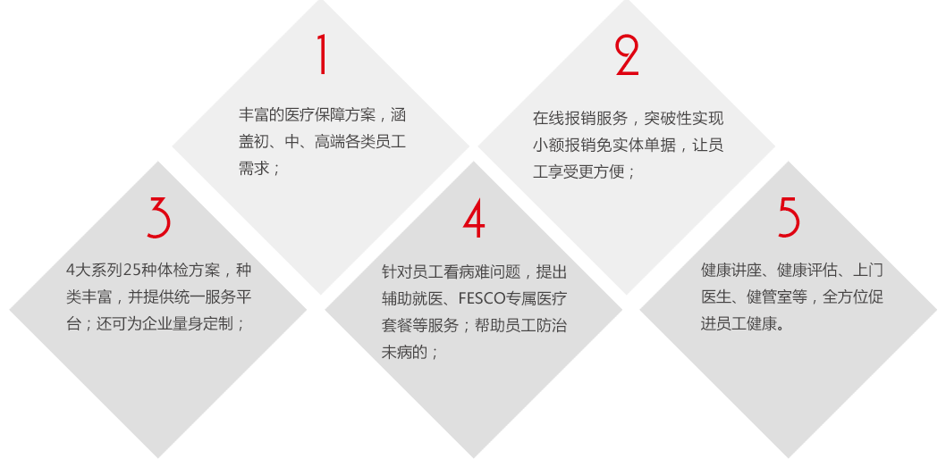 针对员工看病难问题,提出辅助就医、FESCO专属医疗套餐等服务;帮助员工防治未病的;